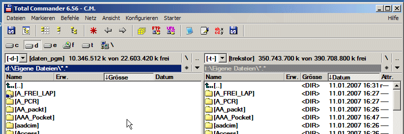 Es handelt sich hier nicht um eine Gebrauchsanweisung sondern um das Aufzeigen einer Möglichkeit. Links werden die Daten auf der Festplatte hier "D:" und rechts die auf dem externen Laufwerk T: gezeigt. Zuvor wurde ebenfalls mit dem TC = " Total Commander " alle "Eigenen Dateien" von D: nach T: kopiert. |