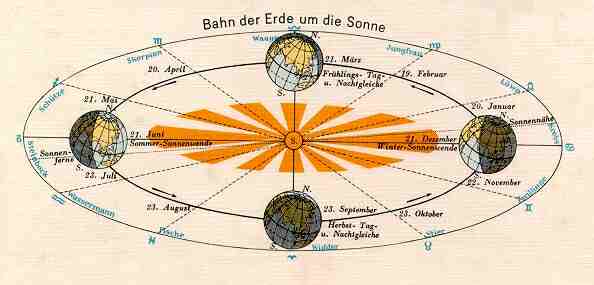 Auch hier ist die Darstellung trügerisch. Ansonsten gilt das was über den Frühling gesagt wird nur daß die Nächte anschließend länger und nicht kürzer werden. Die Sonne ist genau hinter der Erde. |