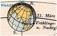 Hier trügt die zweidimensionale Darstellung (quasi leicht von oben) am stärksten. Die Sonne steht senkrecht (im Winkel von 90° zur Neigung).auf der Erdachse; und auch auf dem Äquator und beide Pole sind somit gleichweit von der Sonne entfernt.Tag und Nacht sind gleich lang. Die Sonne geht von Ihren Augen aus. |