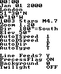 Ganz oben ist die Uhrzeit hier 00.00 Mitternacht Dann folgt das Datum. Falls der Ort bei Dir nicht auf London steht must Du ihn mit L einstellen. Die nächsten beiden Zeilen zeigen an wo der Ort liegt. Die Anzahl der gezeigten Sterne ändern wir mi + oder -. Den Zoomfaktor änderst Du mit z bzw, Shift+ . Die Blickrichtung ist S. Und 50° nach oben (elev) Den Blickwinkel nach oben "elevation" ändern wir mit |