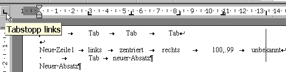 Zum Setzen klicken Sie im Lineal an der gewünschten Position. Mit der Maus können Sie den Tabstopp leicht hin und her ziehen. Zum Löschen ziehen Sie ihn weg vom Lineal ins Nirvana.