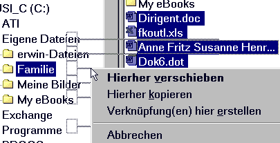 Die ganze Bande ziehen wir nun mit gedrückter rechten Maustaste nach links auf den Ordner "Familie". Der muß blau werden dann lassen wir die Maus los.
