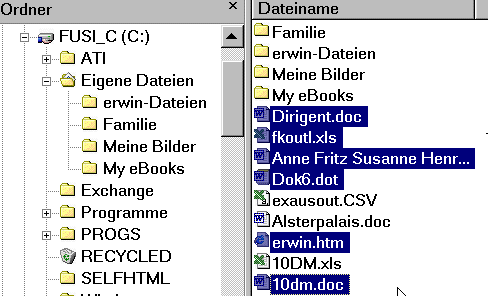 Wir markieren die erste mit Klick lassen die Maus los, gehen zur letzten in Folge, hier Dok6, und drücken die Umschalttaste und Klicken mit der linken Maustaste. Nun gilt es noch erwin und 10DM zu markieren. Wir zeigen mit der Maus darauf, drücken die Strg-Taste und Klicken mit der linken Maus.