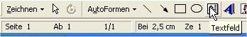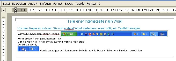 Vor dem Kopieren müssen Sie nun erstmal Word starten. Ich habe mir deswegen Word in die Schnellstart_Leiste gelegt; so brauche ich den Internetexplorer nicht zu minimieren. Und wenn Sie es gewöhnt sind legen Sie ein Textfeld an.