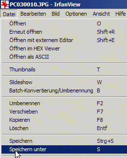 Ok![]() Wenn Sie noch unsicher sind sollten zu Beginn Ihrer Arbeit erstmal mit dem Explorer ein neues Verzeichnis anlegen und Ihre Kandidaten dorthin kopieren. Wenn Sie sie dort mit IrfanView öffnen, können Sie sie, mit gleichem Namen speichern dann brauchen Sie nicht Speichern unter aufzurufen. |