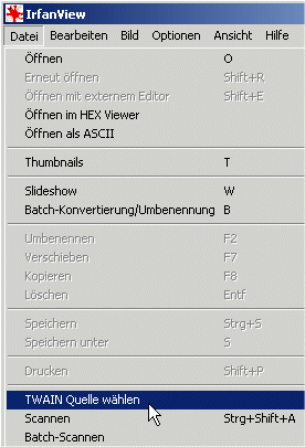 Wir starten ein Programm zur Bildbearbeitung oder -wie hier- einen "Bildbetrachter" nämlich i-view36.exe von Irfan. Dann wählen wir ein für allemal die Quelle für den Scanner. Twain ist die standartisierte Schnittstelle für Scanner. Siehe WIA. Abkürzung für "Windows Image Acquisition". WIA ist eine in neueren Microsoft-Betriebssystem-Versionen (Win Me/XP) integrierte Software-Schnittstelle zur Ansteuerung von Kameras und Scannern auf Betriebssystem-Ebene. Man kann WIA durchaus als Weiterentwicklung von TWAIN bezeichnen, da es wie dieses eine Treiberinstallation voraussetzt, jedoch bereits auf Betriebssystem-Ebene arbeitet. |