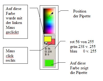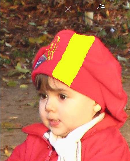 Der Pfahl soll verschwinden. wir nehmen den Kopierpinsel clicken mit der linken Maus irgendwo links hier ca 4 cm dann fährt die Maus nach rechts zum Pfahl und clickt links. Das x zeigt uns von wo, der Pinsel mit Stempel, wohin kopiert wird. Das Umfärben erfolgt mit dem Farbwechsler. Erst wählen wir die Pipette und clicken mit der rechten Maus auf die rote Mütze dann suchen wir ein schönes gelb aus der Farbpallete oder aus dem Bild und clicken links. Erst ist der Pinsel zu dünn wir wählen ihn mit der StilPalette stärker. |