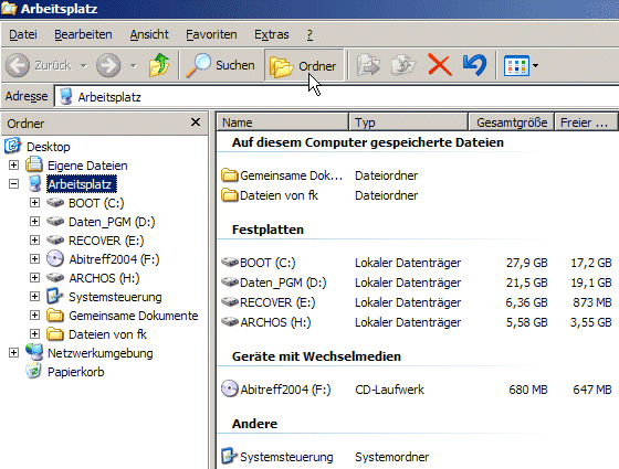 Klick auf Ordner in der Symbolleiste öffnet oder schließt die Ordneranzeige.